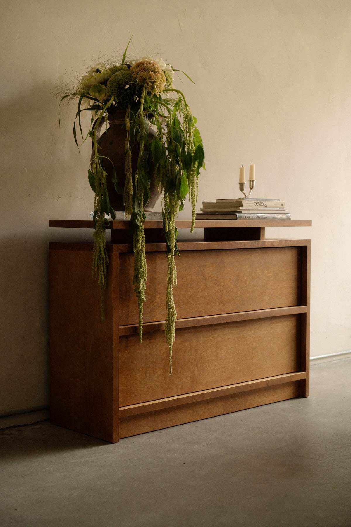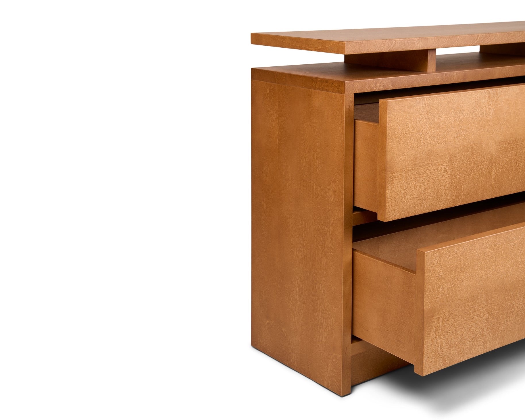 The Ratio Chest offers wide, horizontal drawers with significant closed storage space. Its wide front also allows the grain of the Birchwood to be apparent, and its material influence on the design of the Chest to show through.