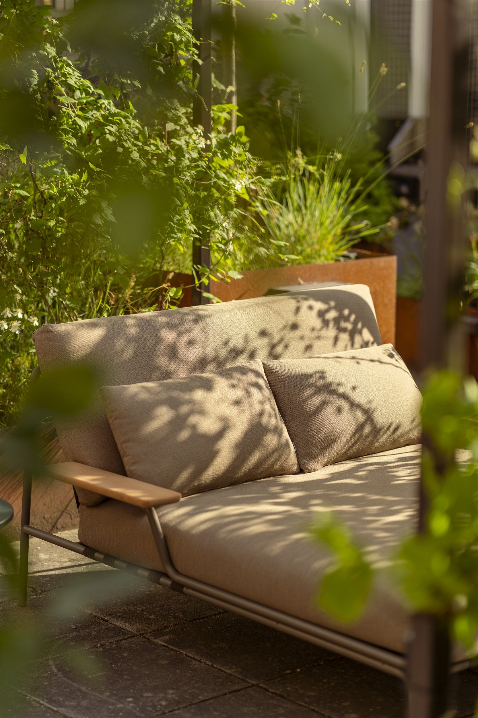 The Settle Lounge Bed w. Armrest invites you to settle into its comfort. With its deep, leaned backrest and extra cushion for added comfort, it's ideal for long, leisurely hours spent unwinding outdoors. Its airy steel frame, complete with visible belts and intricate details, enhances its visual allure from all angles, while its armrests, made from FSC™-certified (FSC-C028824) sapele mahogany wood, add a warm, tactile feel. Settle's steel frame is galvanised, primed, and powder-coated, ensuring corrosion resistance for long-lasting use. The plush cushions, made with quick-dry foam and durable outdoor textiles, offer fast-drying resilience in rain showers and year-round durability when used with an outdoor cover.