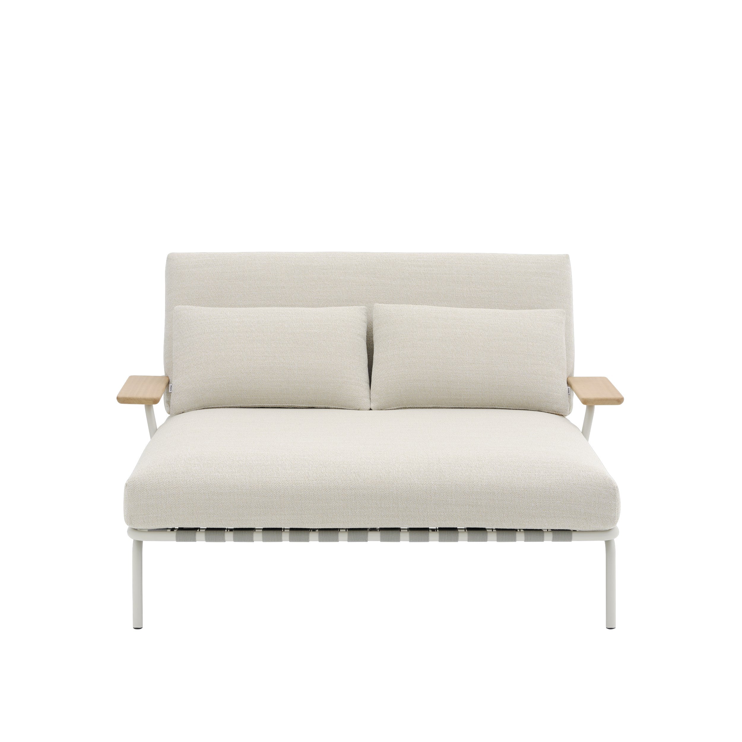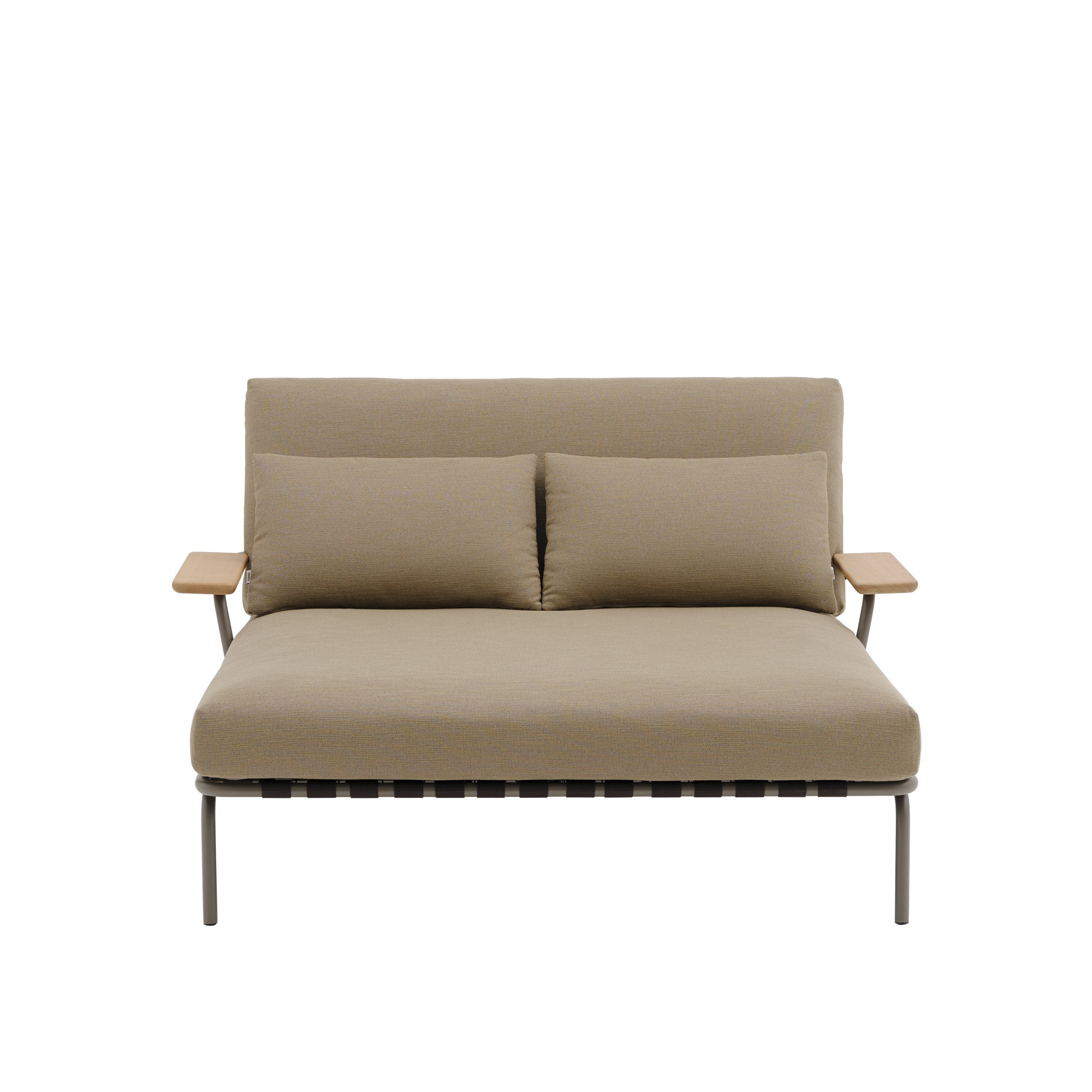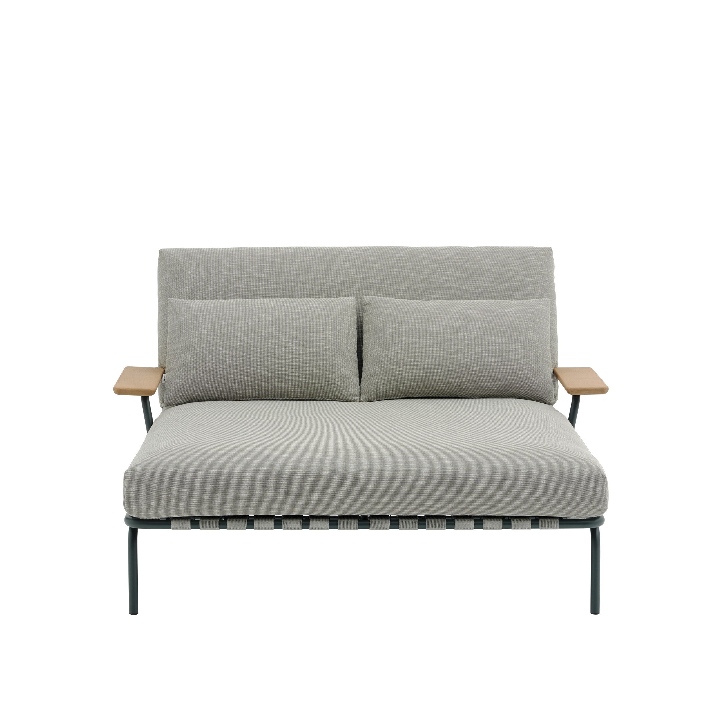 Back cushion: a single outdoor-suited foam core wrapped in wadding, enclosed in an inner lining and finished with outdoor-suited upholstery. The Lounge Bed comes with two loose cushions for extra back support. Seat cushion: Multiple layers of outdoor-suited foam provide enhanced support and comfort. The foam is wrapped in wadding and an inner lining and then finished with outdoor-suited upholstery. An anti-slip feature keeps the cushions securely in place. Bent steel tubes, rods, and plates make up the frame, which is electro-galvanised, primed, and powder-coated. The armrests are made from FSC™-certified (FSC-C028824) sapele mahogany wood. The webbing is made of 72% PP (Polypropylene) and 28% Synthetic Rubber.